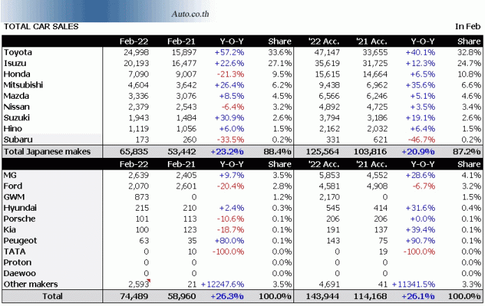 ตลาดรถยนต์กุมภาพันธ์เติบโตทุกเซ็กเมนท์ยอดขายรวม 74,489 คัน เพิ่มขึ้น 26.3%
