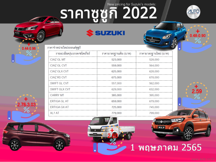 7 เมษายน 2565-กรุงเทพ- รายงานข่าวจากบริษัท ซูซูกิ มอเตอร์ (ประเทศไทย) จำกัดผู้ผลิตและจำหน่ายรถยนต์ซูซูกิ แจ้งว่าบริษัท ประกาศเตรียมปรับเพิ่มราคาจำหน่ายรถยนต์ซูซูกิ เริ่มตั้งแต่วันที่ 1 พฤษภาคม 2565 เป็นต้นไป