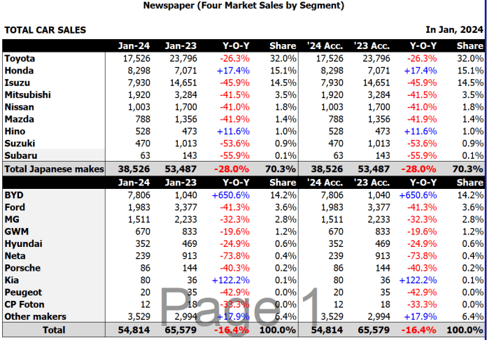ตลาดรถยนต์ไทยยังหาจุดเริ่มต้นไม่ได้ สท้อนภาพเศรษฐกิจโดยรวมดิ่งเหว ซึ่งเป็นการลดลงต่อเนื่องจากปีที่แล้ว นายศุภกร รัตนวราหะ รองกรรมการผู้จัดการใหญ่ บริษัท โตโยต้า มอเตอร์ ประเทศไทย จำกัด ในฐานะผู้รับผิดชอบรายงานสถิติการขายรถยนต์ ของภาคการขายในอุตสาหกรรมรถยนต์ไทย เปิดเผยว่า ยอดจำหน่ายรถรวมทุกยี่ห้อ ประจำเดือนมกราคม ซึ่งเป็นการเปิดฤดูกาลขายประจำปี 2567 มีจำนวน 54,814 คัน ลดลง 16.4% เมื่อเทียบกับระยะเวลาเดียวกันของปีที่แล้ว