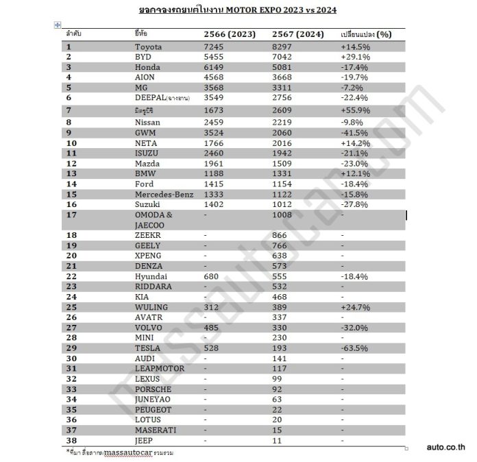 สำหรับยอดจองรถในงาน แบ่งเป็นรถยนต์ 54,513 คัน จักรยานยนต์ 7,982 คัน และจากข้อมูลผู้ร่วมกิจกรรม “ซื้อรถ…ชิงรถ” พบว่า มีผู้ร่วมกิจกรรมมากกว่าปีที่แล้ว โดยเป็นรถยนต์ที่ใช้เครื่องยนต์ (สันดาป, ไฮบริด และพลักอิน-ไฮบริด) 58.7 % และรถยนต์ไฟฟ้า 41.3 % รถยนต์ที่ผู้ซื้อเข้าร่วมกิจกรรมสูงสุด 3 อันดับแรก ได้แก่ HONDA, BYD, TOYOTA ส่วนรถเครื่องยนต์ที่มียอดจองสูงสุด ได้แก่ HONDA, TOYOTA, FORD ด้านรถยนต์ไฟฟ้า (BEV) ที่มียอดจองสูงสุด ได้แก่ BYD, AION, GEELY